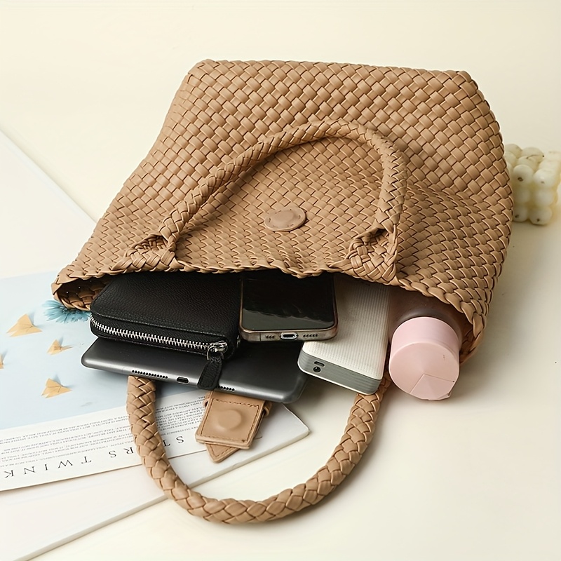 Handwoven Tote Bag for Women - Classic Large Capacity Synthetic Faux Leather Shoulder Bag with Double Handles, Elegant Black Travel & Commuter Handbag with Secure Buckle Closure, Everyday Carry Bag, Durable Stitched Detail