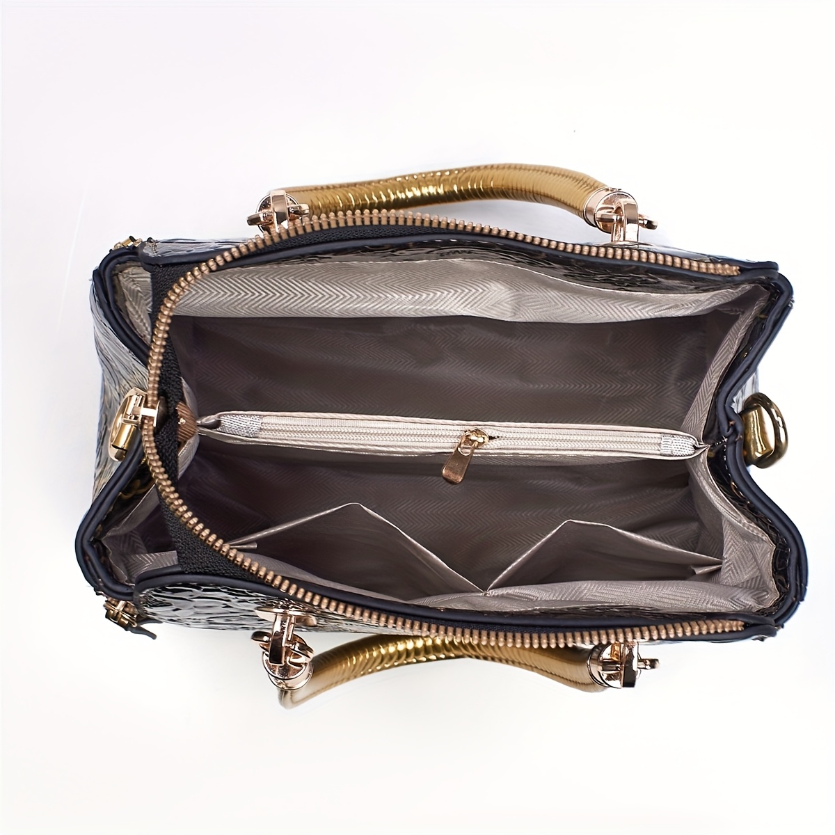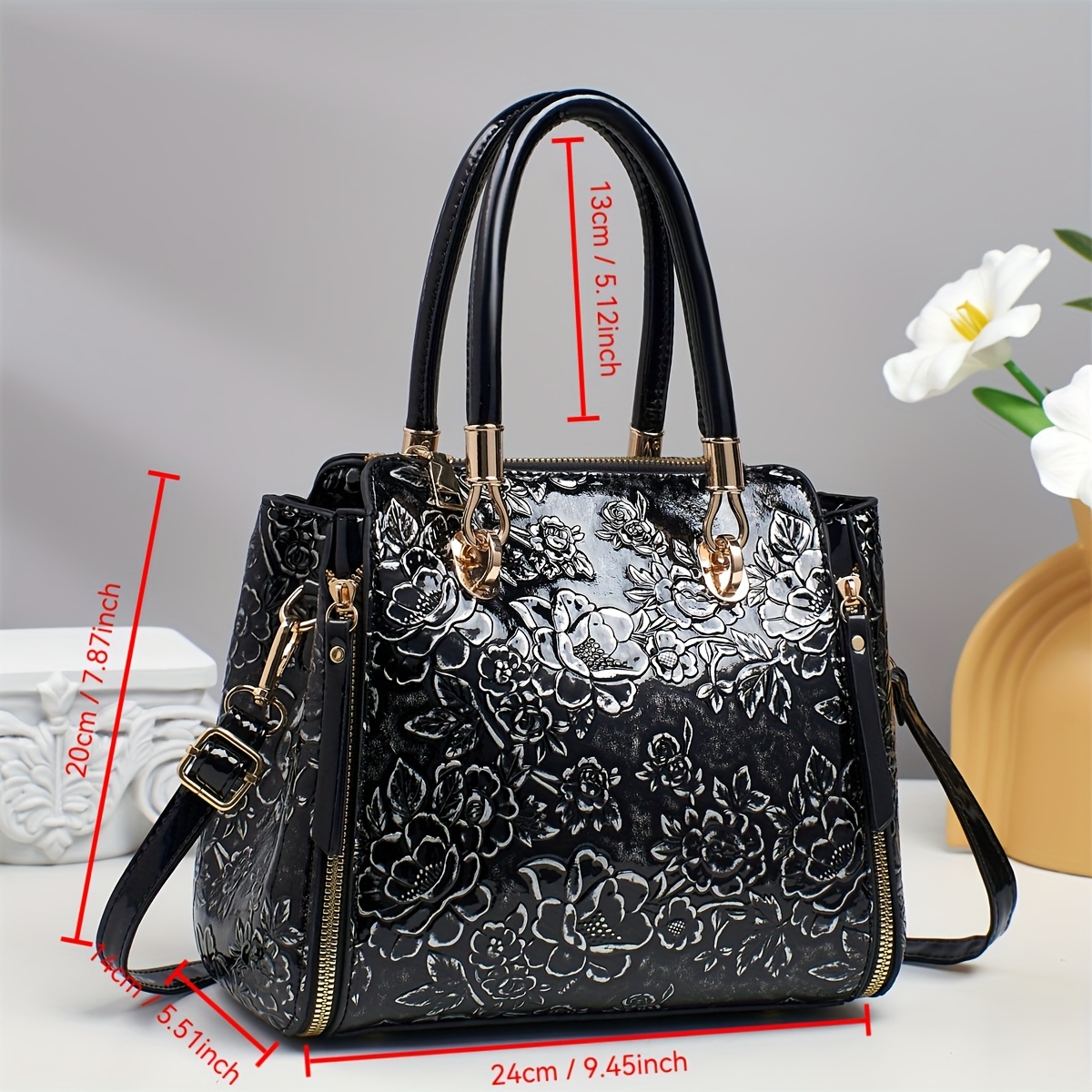 Vintage Floral Print PVC Women's handbag with Adjustable Crossbody/Handheld Strap, Golden-Tone Hardware & Zipper Closure - Black & Golden, Wrist Strap Included, Polyester Lining for Casual & Formal Events, Fashion Accessory, Retro Bucket Bag